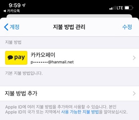 11. 다시 앱스토어를 들어가서 확인해보면 지불 방법에 카카오페이가 추가 되어 있다.