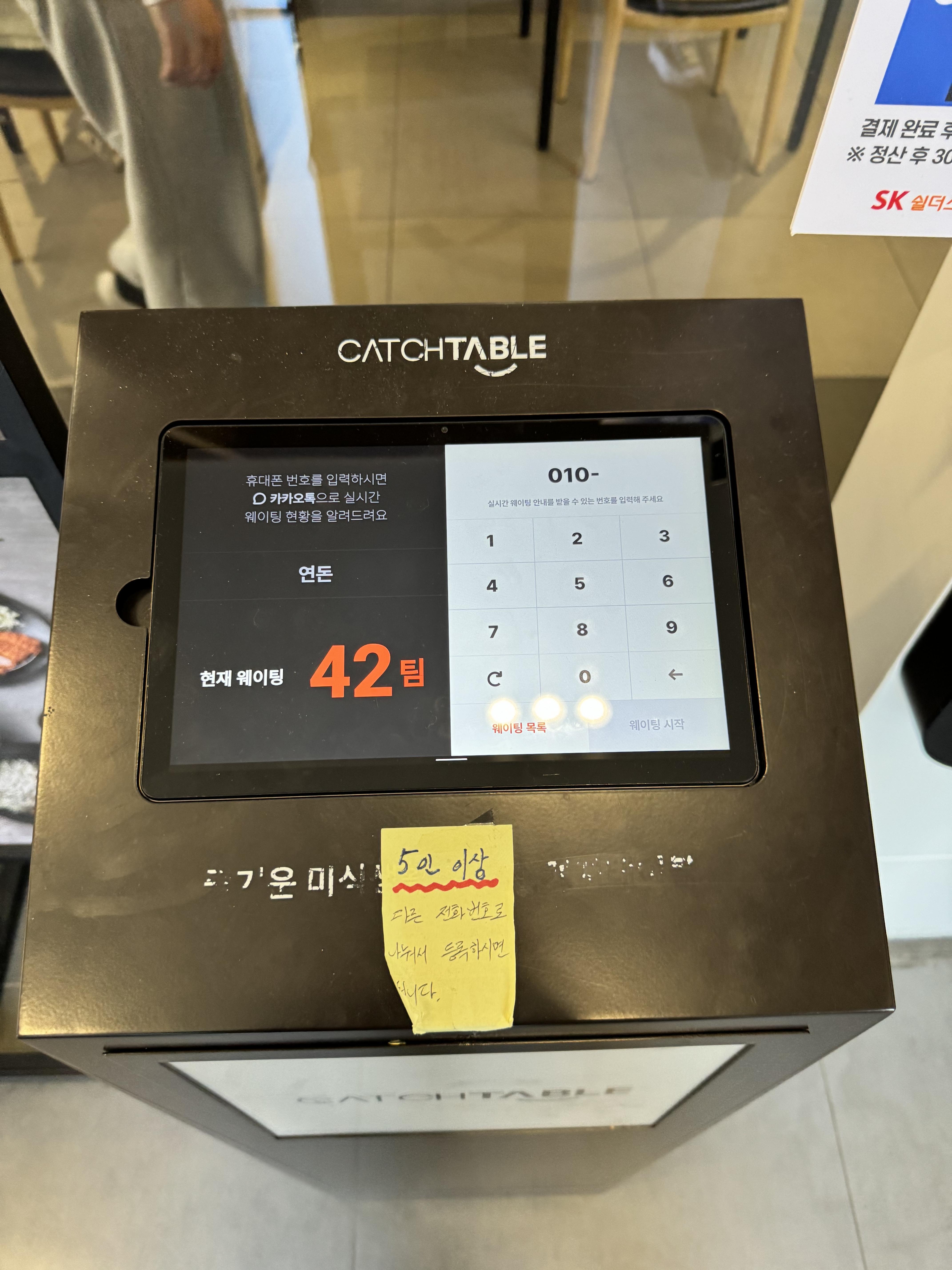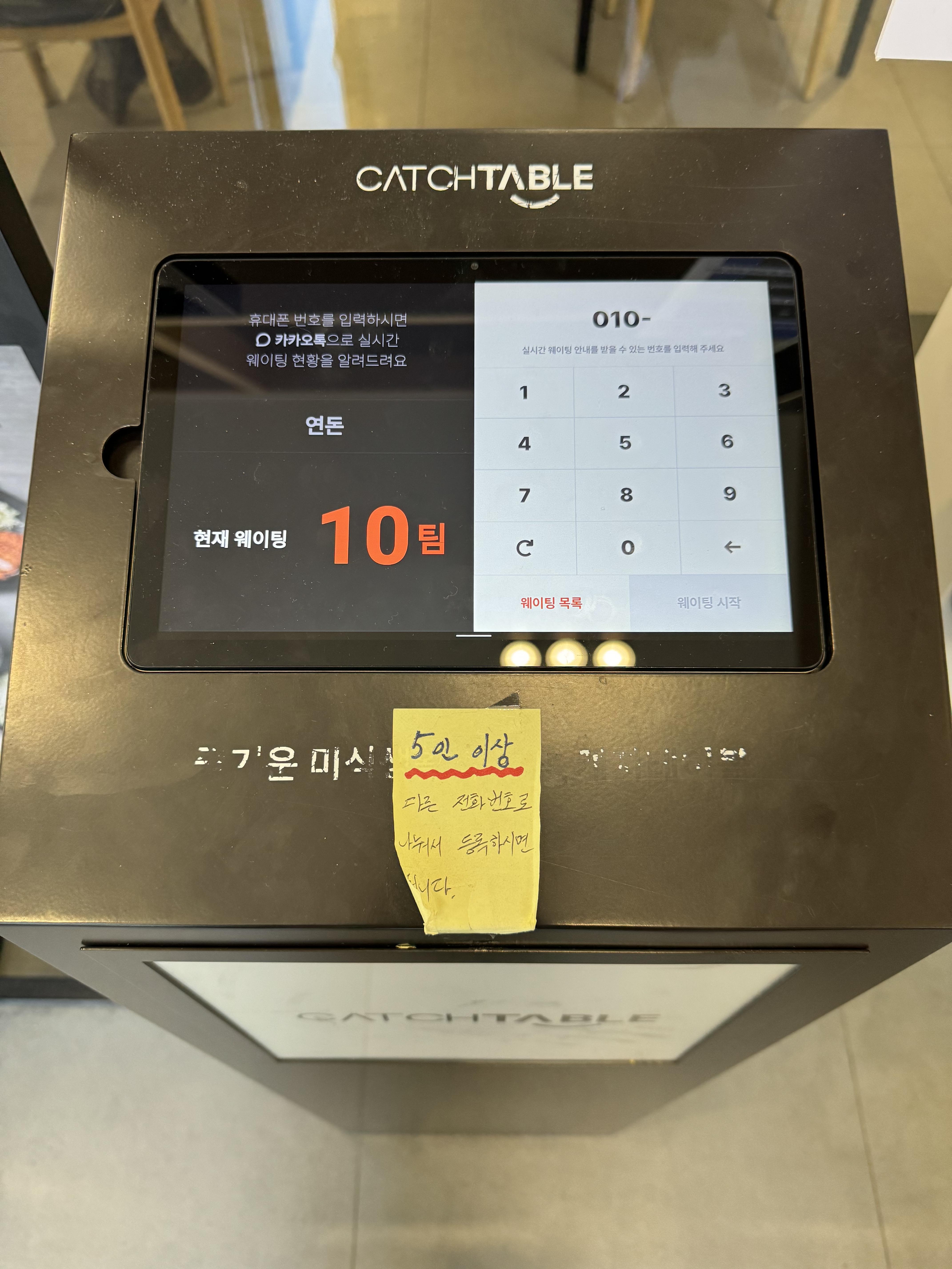 정문에 들어가시면 앞에 캐치테이블 기계가 2대 있는데 휴대폰 번호를 입력하시면 예약이됩니다.