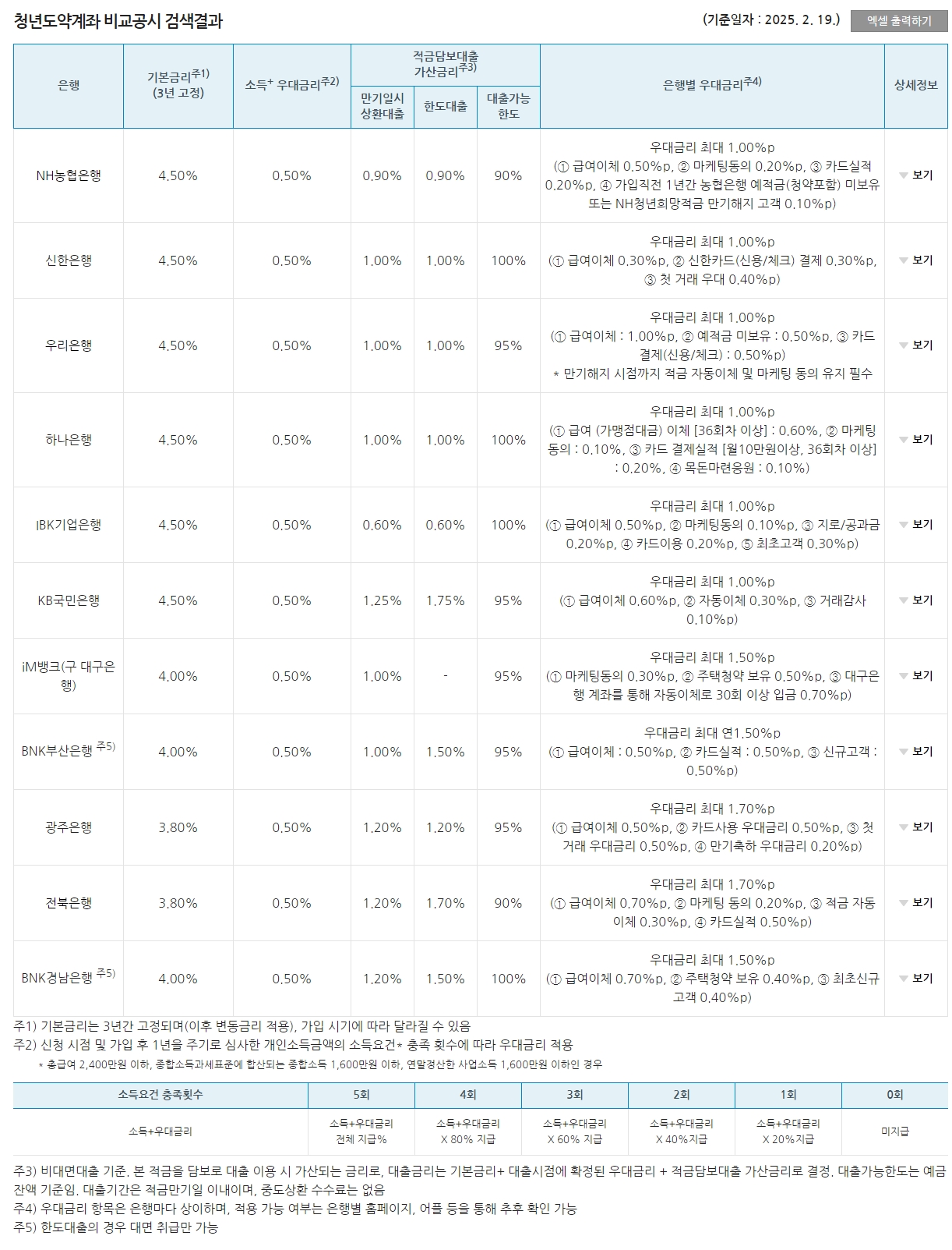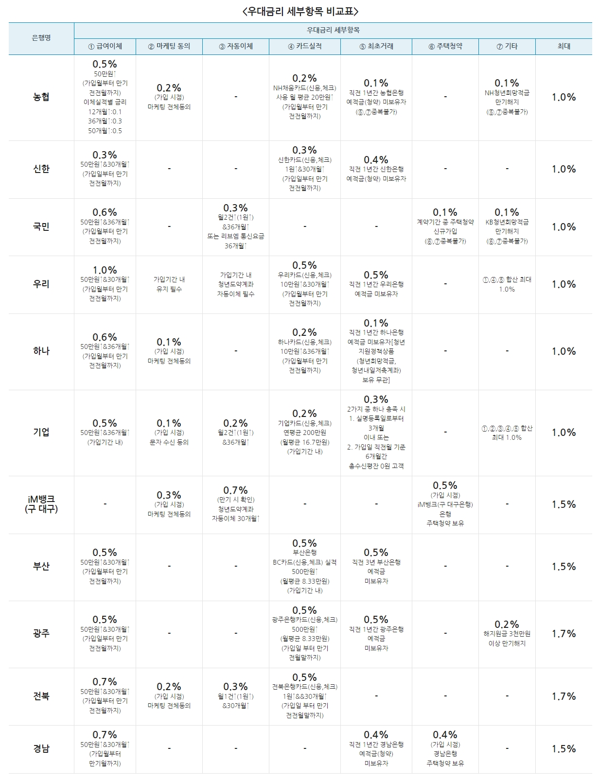 우대금리 세부항목 비교표입니다.