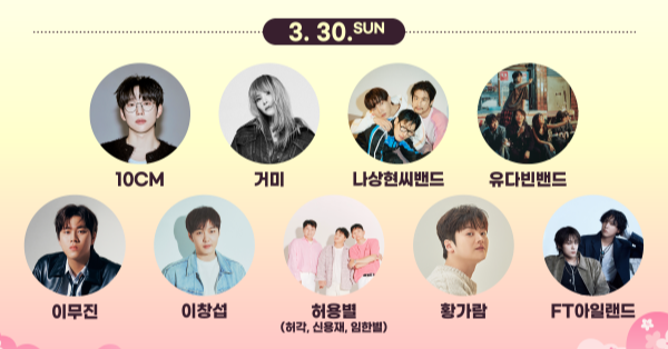 3월 30일에는 10CM, 거미, 나상현씨밴드, 유다빈밴드, 이무진, 이창섭, 허용별(허각, 신용재, 임한별), 황가람, FT아일랜드가 온다고합니다!!