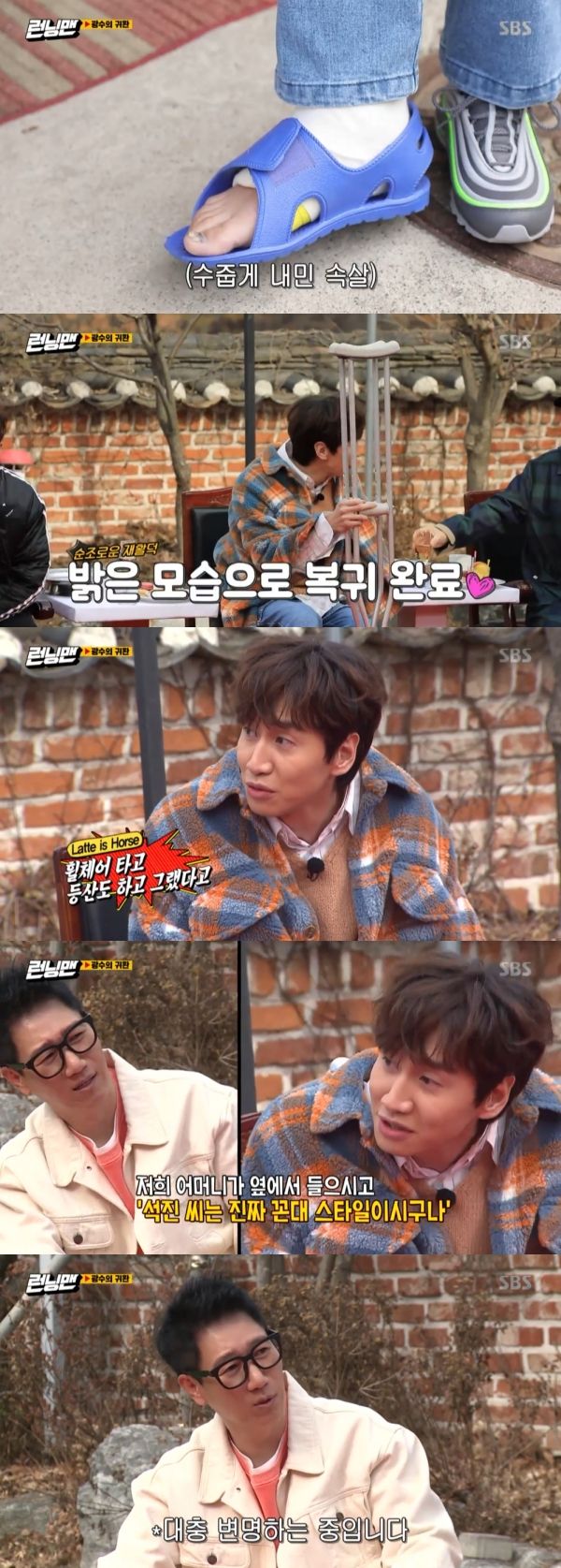 송지효가 "광수야 보고 싶었다"라고, 유재석이 "그래도 이제 목발 짚고 다닐 수 있어서 다행이다"라며 반겼습니다. 이어 이광수는 지석진을 향해 "병원에 있을 때 전화 자주 해주셨다"라고 말했습니다.