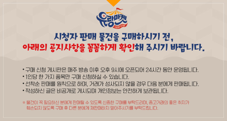 또한, 현재 포털사이트에서 ‘유랑마켓’ 으로 운영되고 있는 상품 판매 스토어는 저희 방송과 무관한 사이트이니 참고 부탁드리며, 이후 착오 없으시길 바랍니다.