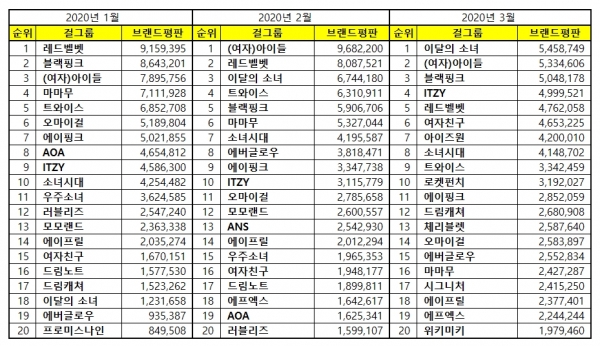 2020년 3월 걸그룹 브랜드평판 30위 순위는 이달의 소녀, (여자)아이들, 블랙핑크, ITZY, 레드벨벳, 여자친구, 아이즈원, 소녀시대, 트와이스, 로켓펀치, 에이핑크, 드림캐쳐, 체리블렛, 오마이걸, 에버글로우, 마마무, 시그니처, 에이프릴, 에프엑스, 위키미키, 우주소녀, 러블리즈, AOA, 애프터스쿨, 드림노트, ANS, 스텔라, 티아라, CLC, 공원소녀 순이었습니다.