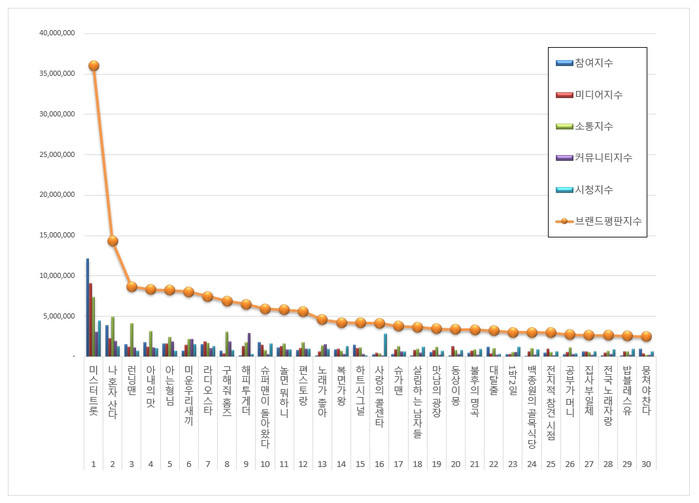 1위, 미스터트롯 브랜드는 참여지수 12,133,933 미디어지수 9,053,469 소통지수 7,379,169 커뮤니티지수 3,038,374 시청지수 4,407,379가 되면서 브랜드평판지수 36,012,324로 분석됐다. 지난 3월 브랜드평판지수 29,849,874와 비교하면 20.64% 상승했습니다.
